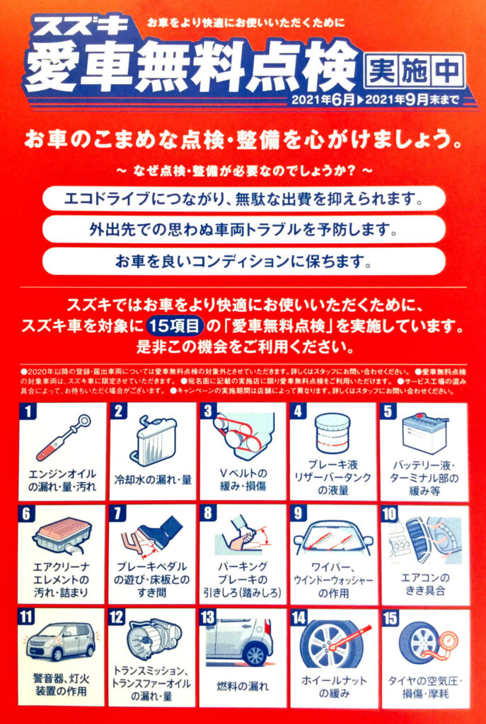 6月1日~9月30日まで、スズキのお車を対象に愛車の無料点検を実施いたします!