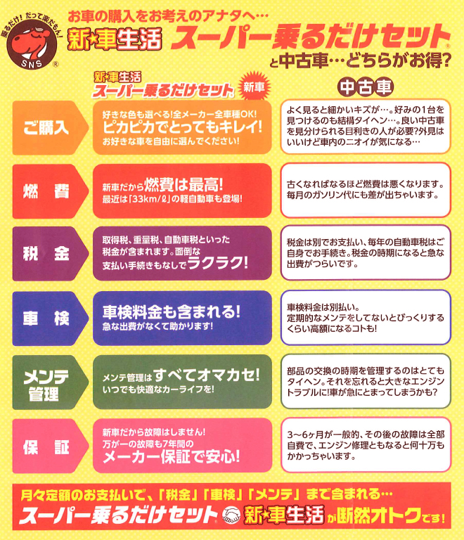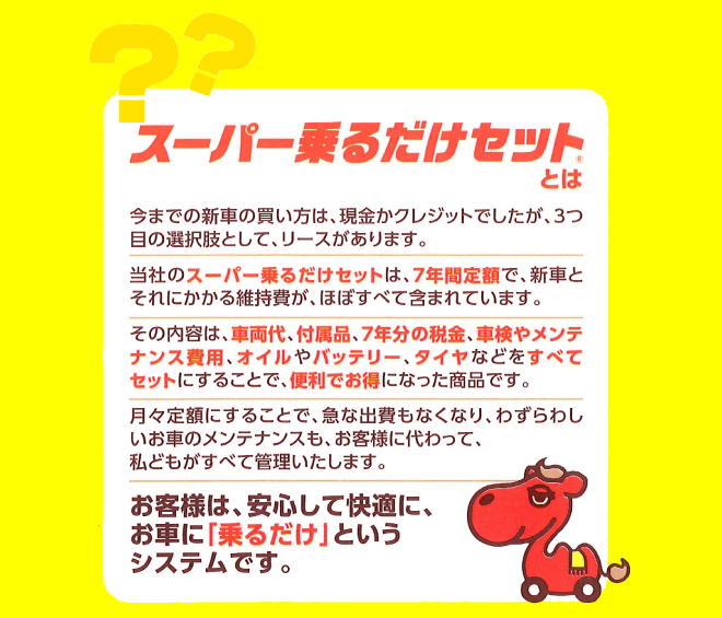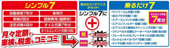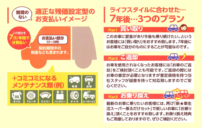 車検やメンテナンスの料金がすべて含まれているスーパー乗るだけセットなら、月々一定のお支払い、充実のメンテナンスで安心・安全に新車にお乗りいただけます!